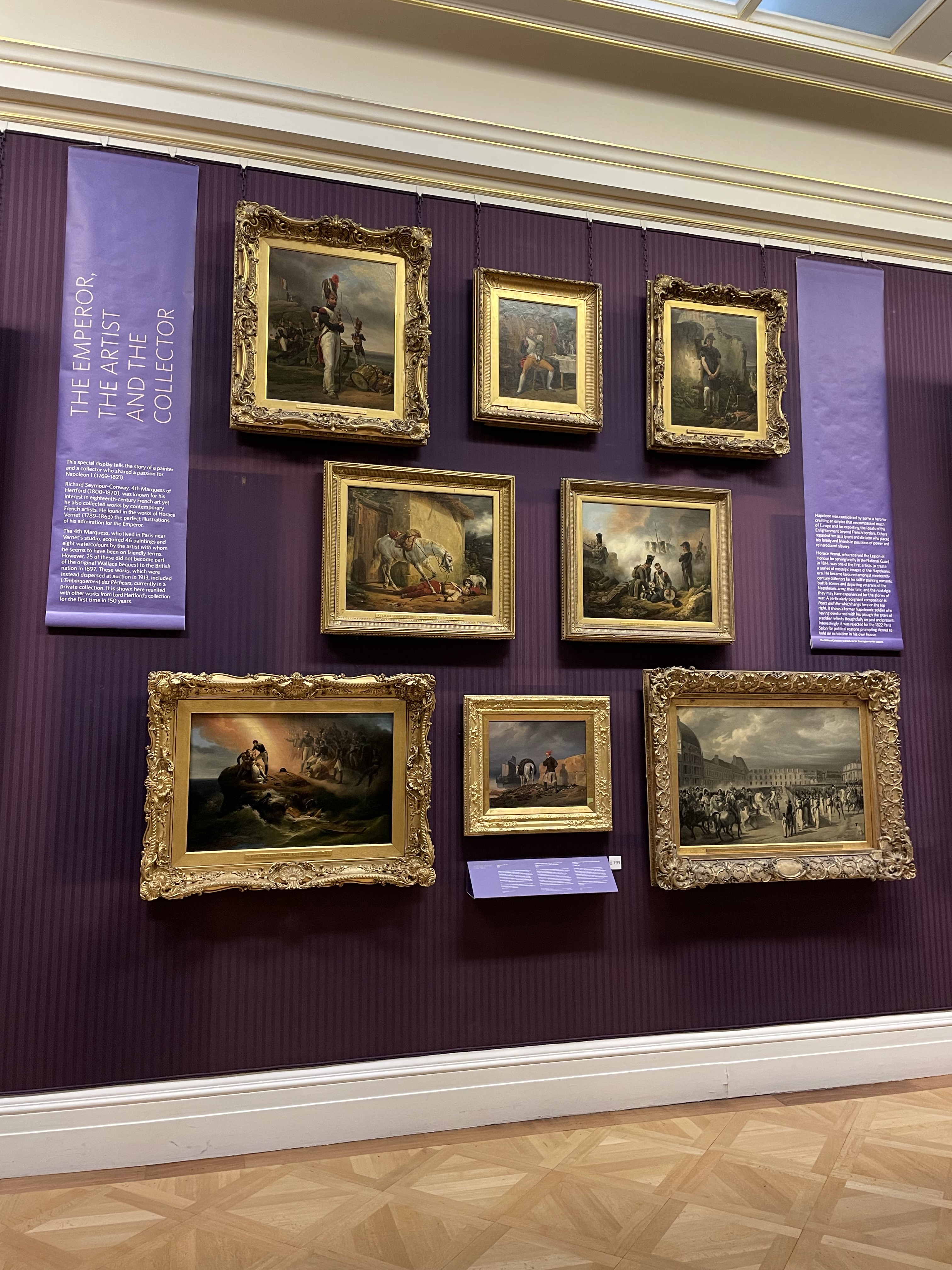 Both the Marquis and Vernet admired Napoleon. Vernet’s work reflected this admiration both in his early work when Napoleon was in power and later during the Bourbon Restoration. He created a nostalgic image of Napoleon and of the generals and troops who had served under him. Richard Seymour, the 4th Marquis of Hertford, loved near Vernet’s studio in Paris and bought 46 paintings and 8 watercolours. He had been just 15 at the time of Waterloo.
